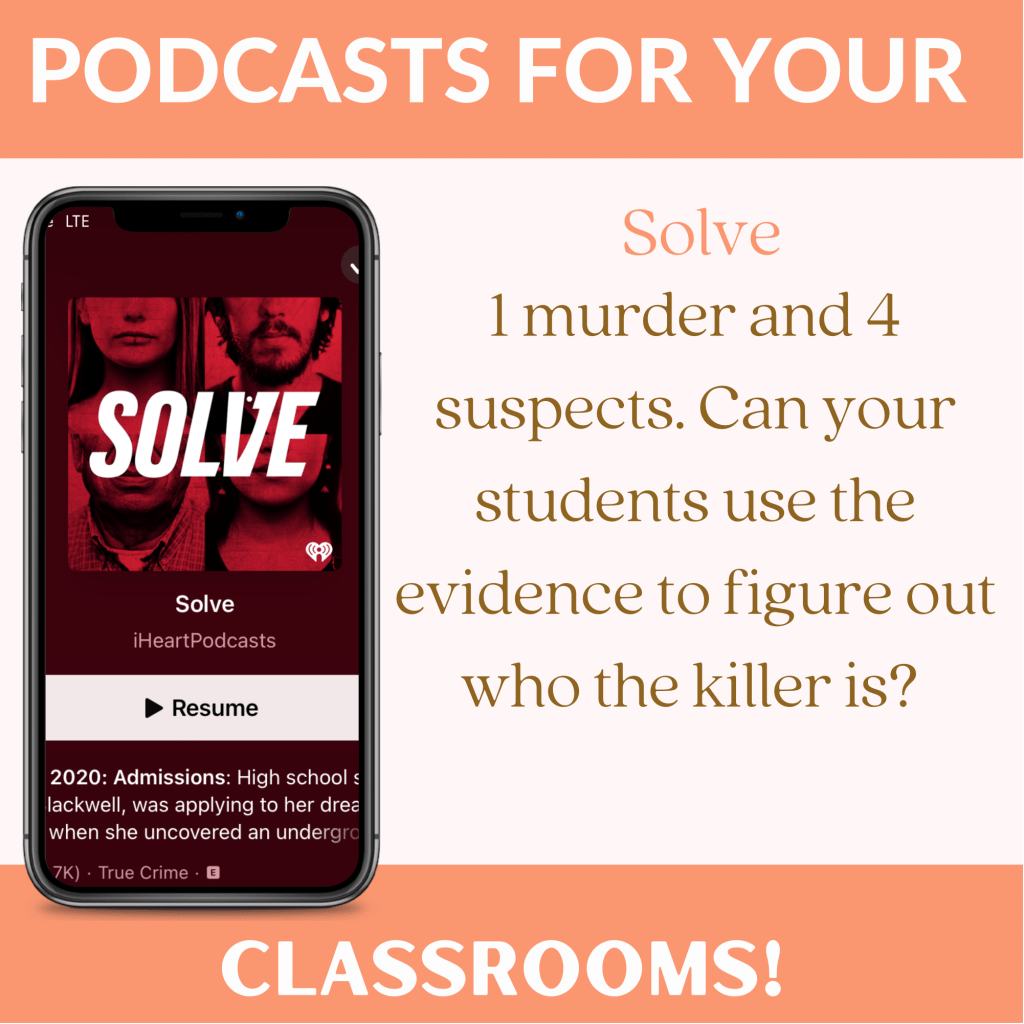 The Solve podcast is an interactive podcast that puts the listener into the role of detective in a murder mystery. These crimes are based off of real life stories. With this tool, you can take your student’s inference and evidence gathering skills to a whole new level! There are always 4 main suspects and you go through the clues each one gives to determine who the true murderer is.