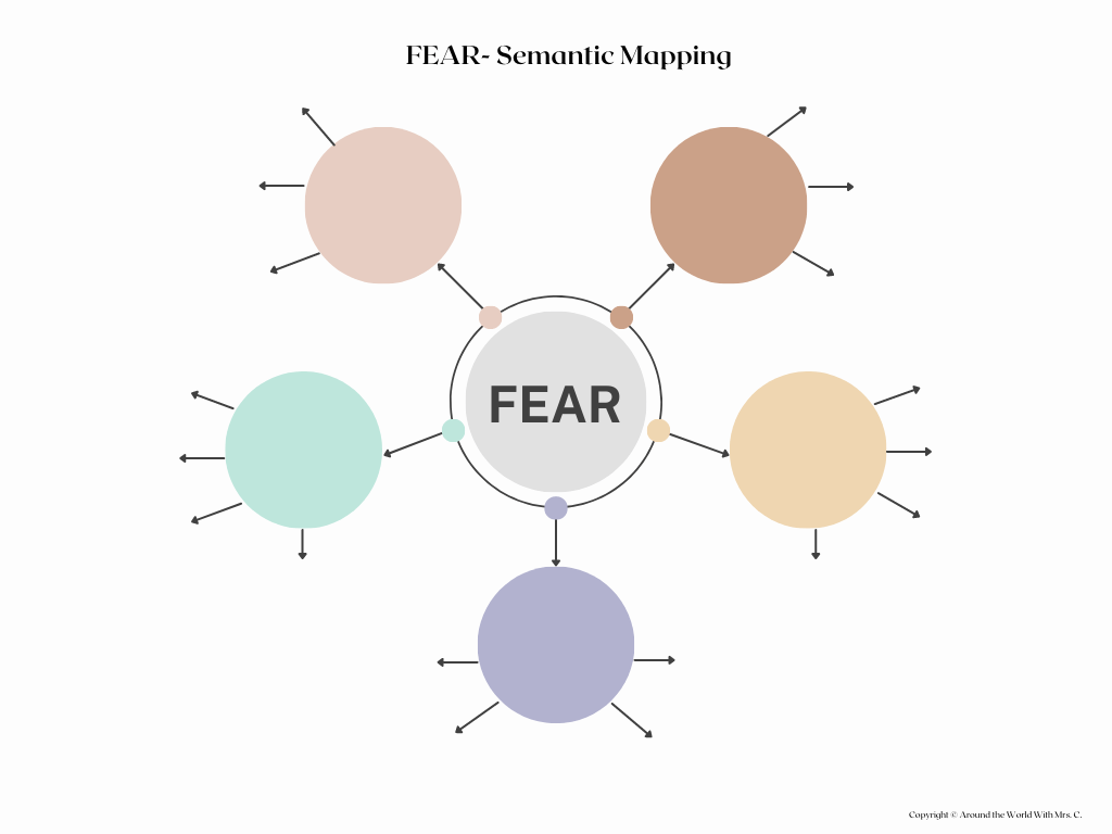 1. Begin by giving students my mapping handout with the word ‘fear’ in the center. You can have them work independently or in small groups/pairs first and then come together as a class after a few minutes.