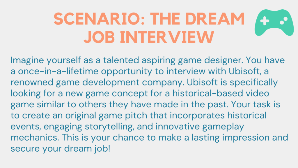Ideally, your students have already had some exposure to lots of history and will have some ideas of what they would love to make their focus to really dive in deep and create an immersive world for their video game pitch.