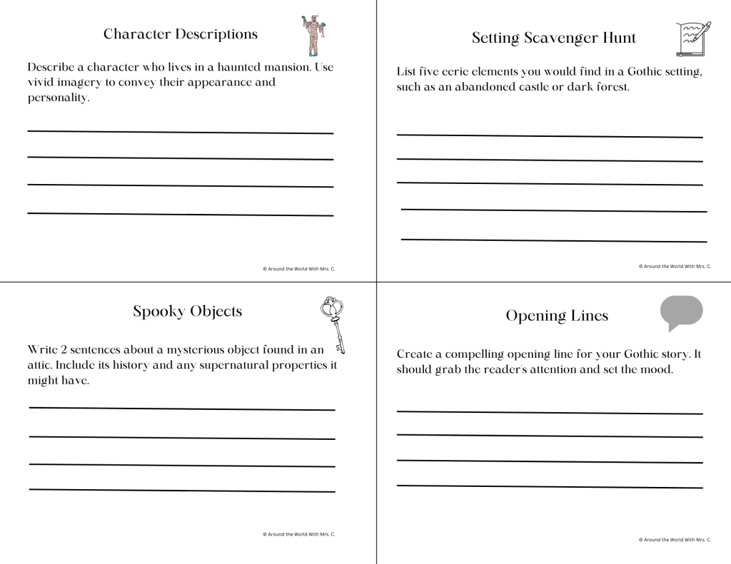 - Task cards: Have students complete a very short and targeted writing prompt. For example, these 12 task cards are for narrative writing asking students to target 1 example and a sample. There’s also these Gothic writing ones!