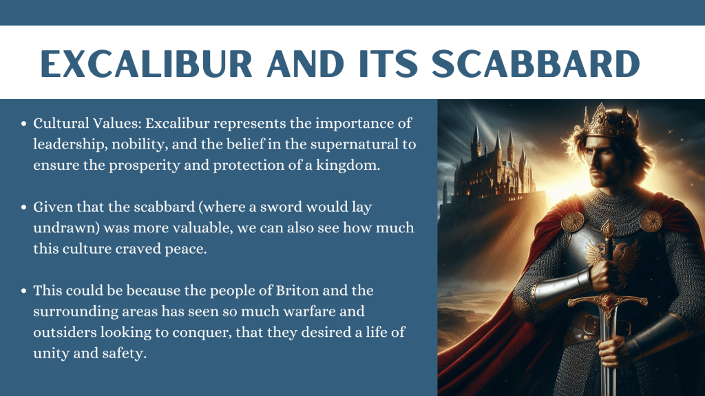 Cultural Values: Excalibur represents the importance of leadership, nobility, and the belief in the supernatural to ensure the prosperity and protection of a kingdom. Given that the scabbard (where a sword would lay undrawn) was more valuable, we can also see how much this culture craved peace.