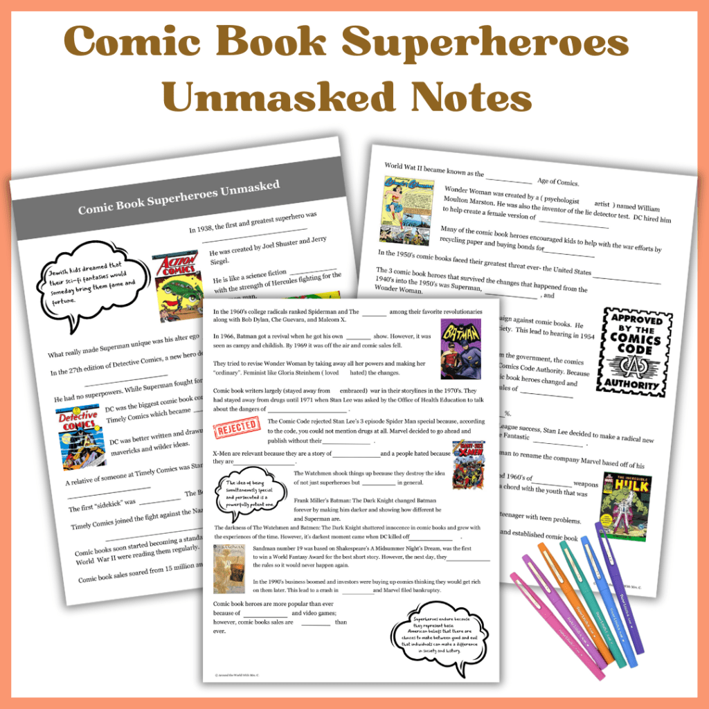 So, instead, I would use Superheroes Unmasked. This documentary offers more of a crash course in the cultural and historical significance of comic book heroes. It covers how superheroes evolved in response to wars, political movements, and shifting societal values. In my ready-to-go-unit, I provide a structured note-taking guide so students can track how American history shaped these characters.